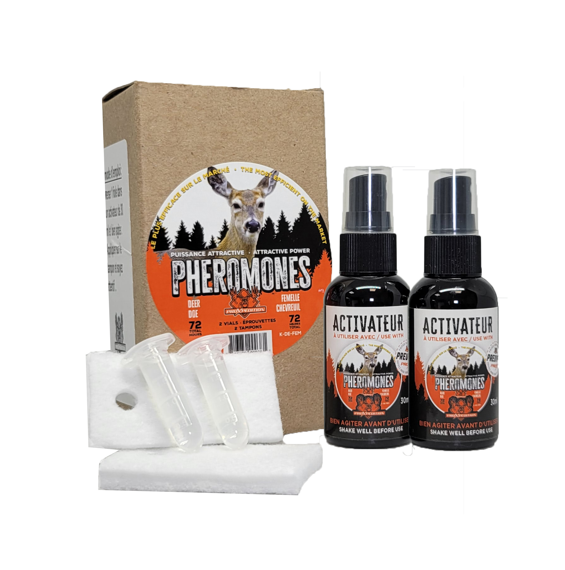 Arouse the curiosity of whitetail deer with our doe pheromones. Pheromones are chemical substances released by animals that trigger significant reactions in others. This product signals to deer the presence of a new doe in their territory, encouraging them to visit your hunting site. Note that this product does not indicate that the doe is in heat; it simply marks the presence of a new animal in the area. Laboratory tests confirm that the scent remains potent for the first 36 hours and diminishes rapidly thereafter. Each package of Mule Deer Doe Pheromones includes 2 flasks of pheromones, 2 activators, and 2 pads—everything you need to attract more deer to your chosen spot. Directions: Pour one flask of pheromones into an activator, mix well, then pour the mixture onto a pad and place it where you want to attract the game.
