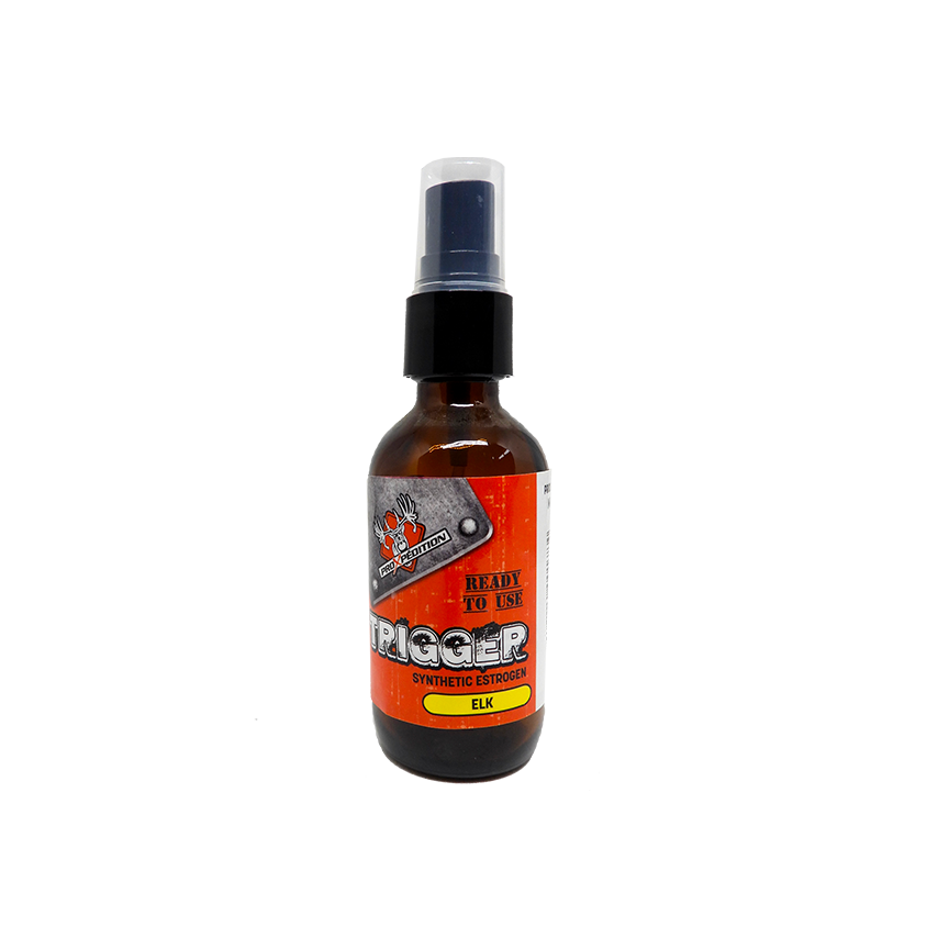 Looking to attract a bull in rut? Try Trigger, a ready-to-use synthetic estrogen designed to mimic a cow's ovulation. Crafted in the lab to replicate the exact scent of estrogen from a cow in heat, Trigger offers the precise aroma bulls are seeking during mating season. Its high-quality performance will make it your go-to choice year after year. Easy to use, simply add Trigger to urine, sexual lures, or synthetic urine pads. Trust Trigger, because it works!